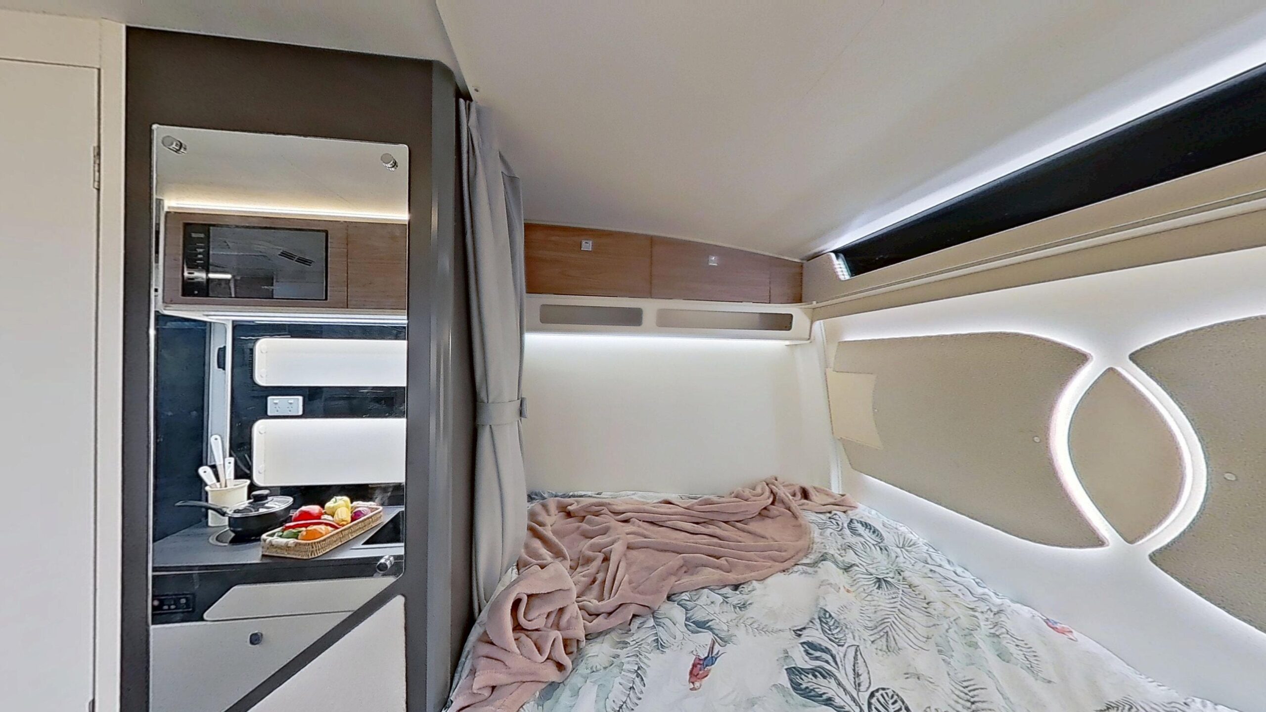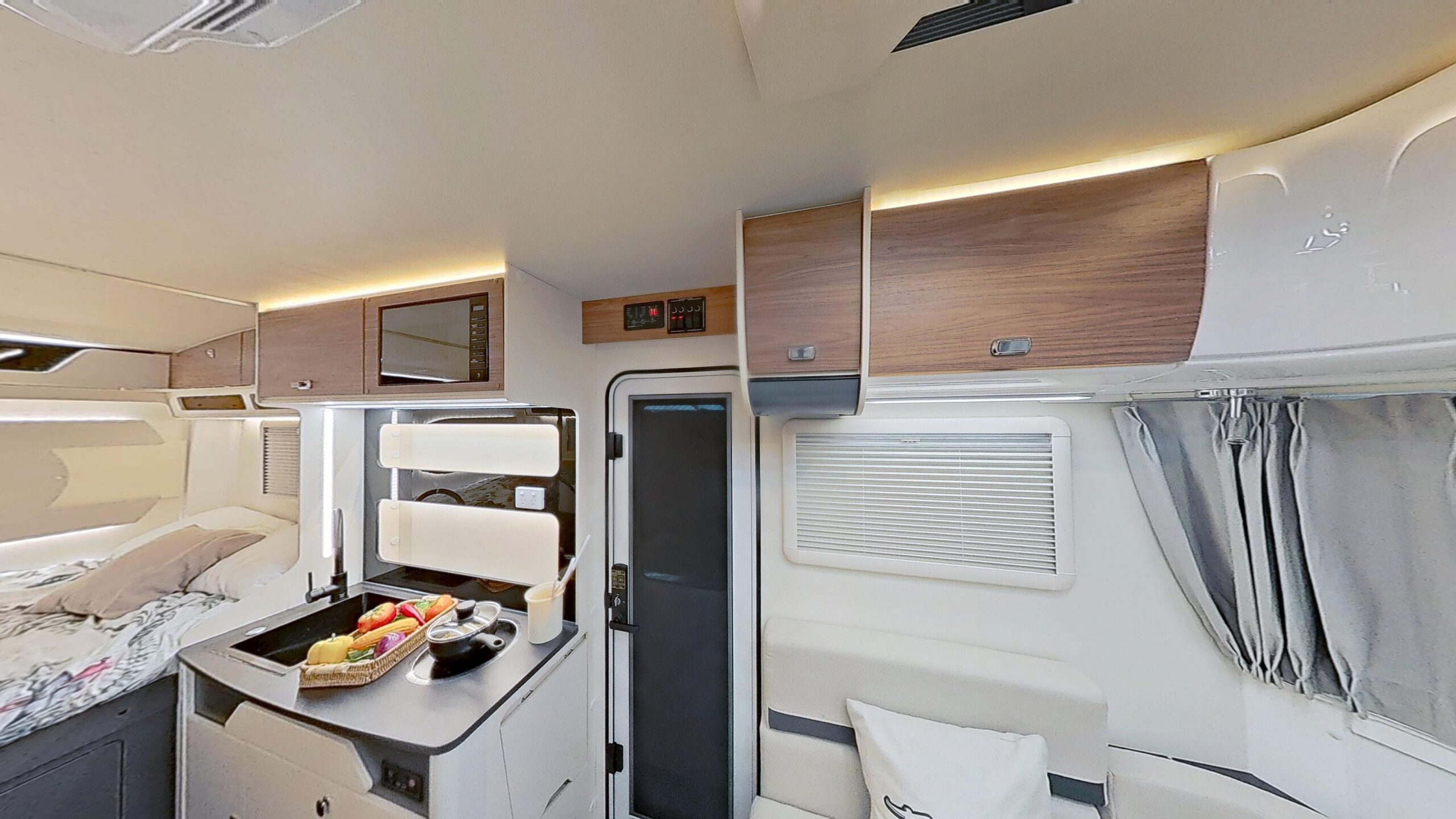 Designed to maximize space, the Cubby’s kitchen offers all the essentials without compromise. The large countertop, stainless steel sink, and electric cooktop are cleverly arranged to provide a full cooking experience. With the integrated 118L fridge and 20L microwave, you have everything you need in one compact, efficient space, making your travels both comfortable and convenient.